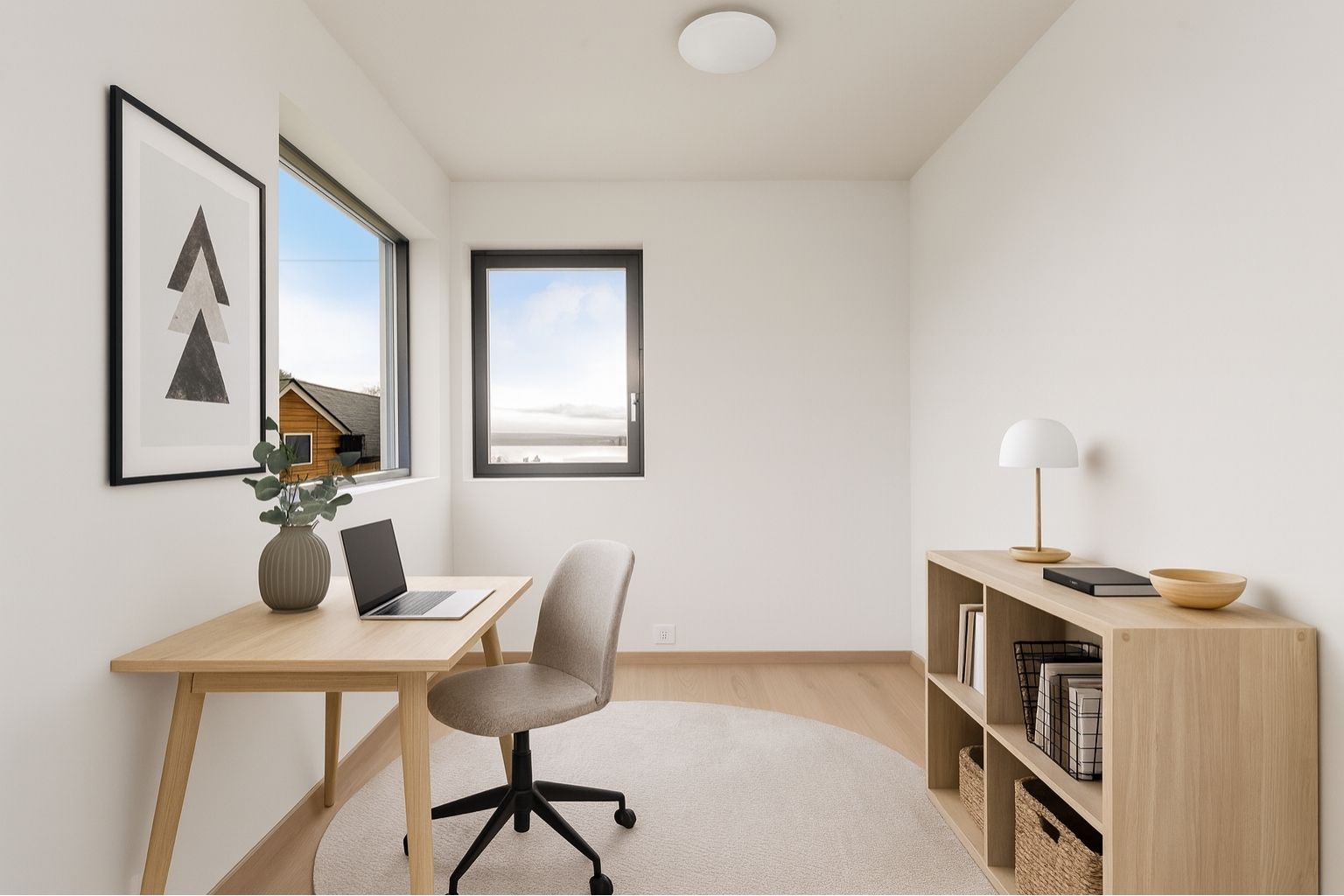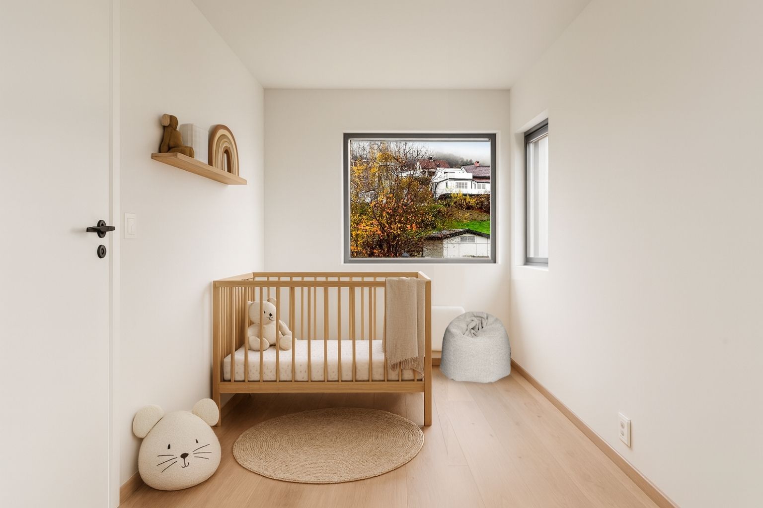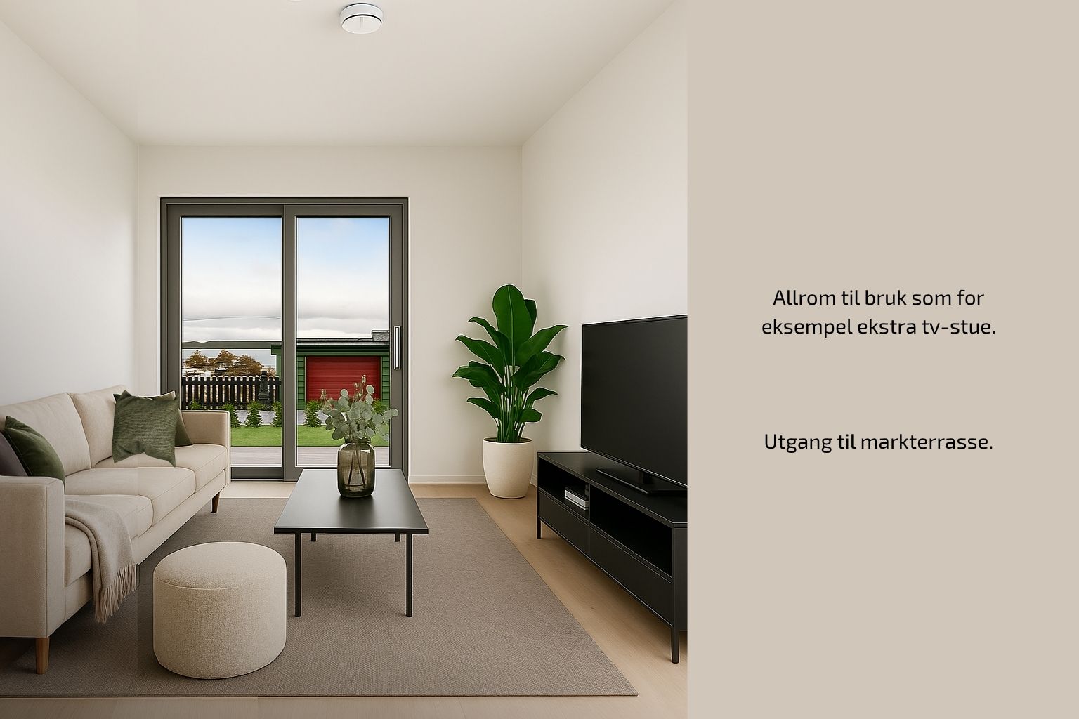 Entre/hall, vaskerom/bod, bad, gang og 2 soverom, hvorav det ene har utgang til markterrasse og hage. Interert garasje og sportsbod. I tillegg medfølger en ekstra garasjeplass i oppført dobbeltgarasje.